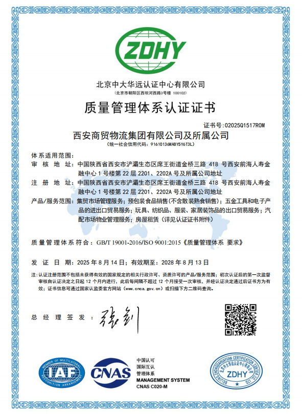 近日,西安商貿物流集團及所屬公司獲得ISO9001質量管理體系認證證書。這是集團組建成立后在推進戰略規劃、塑造品牌形象、提升國內外綜合實力進程中的又一重要成果,標志著集團在國際化、制度化、規范化管理方面邁上新臺階。