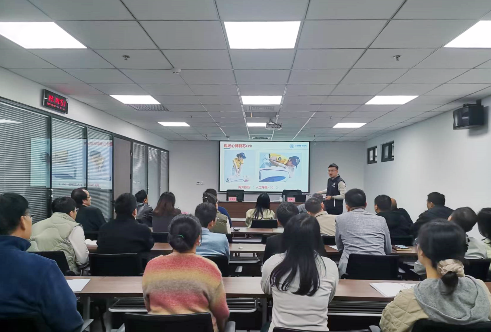 講座邀請到了安全健康教育網陜西站教科主任張肅毅授課。講師結合真實案例,從職工實際需求出發(fā),聚焦應急救護、職業(yè)病防護、職場心理健康三大核心模塊分層講解。在應急救護方面,細致拆解心肺復蘇的操作要點,幫助大家真正掌握關鍵施救技巧;結合伏案工作特性,量身定制“正確坐姿+定時拉伸+規(guī)律運動” 的防護組合策略;針對工作生活中易發(fā)的負面情緒,傳授識別、疏導實用技巧,引導大家以積極心態(tài)應對挑戰(zhàn)。